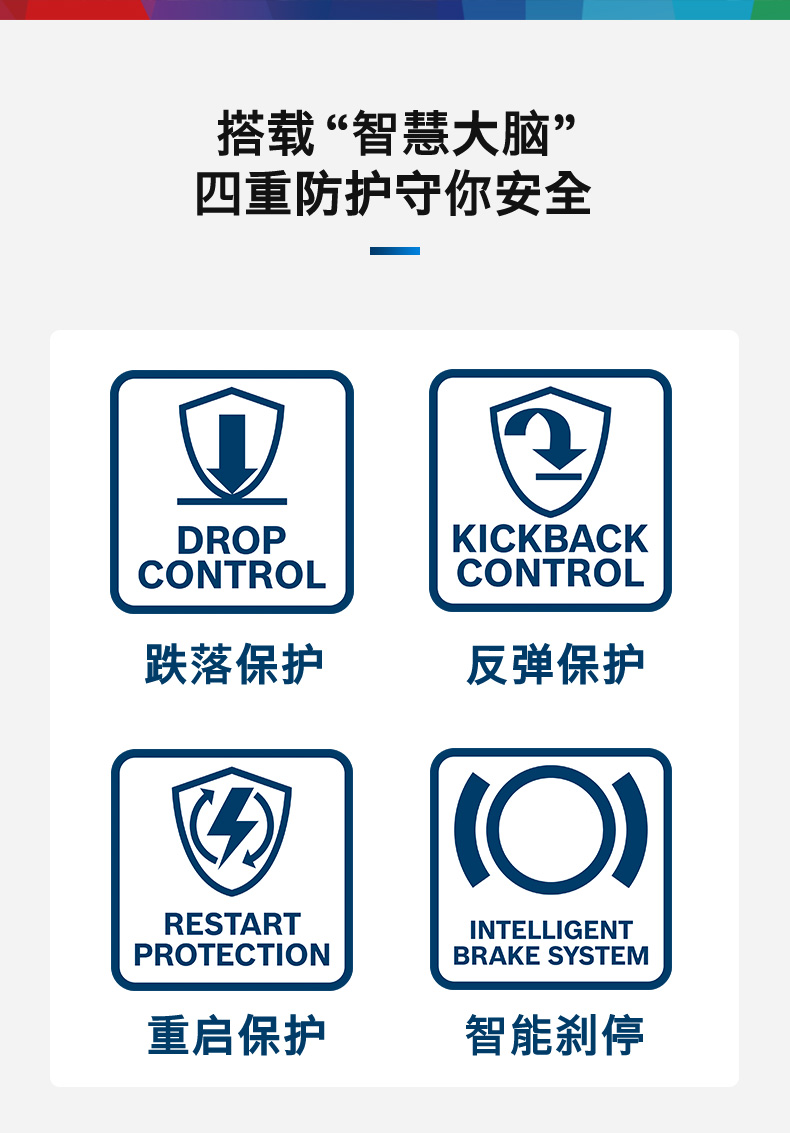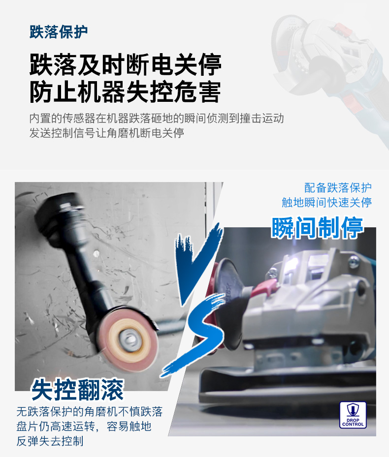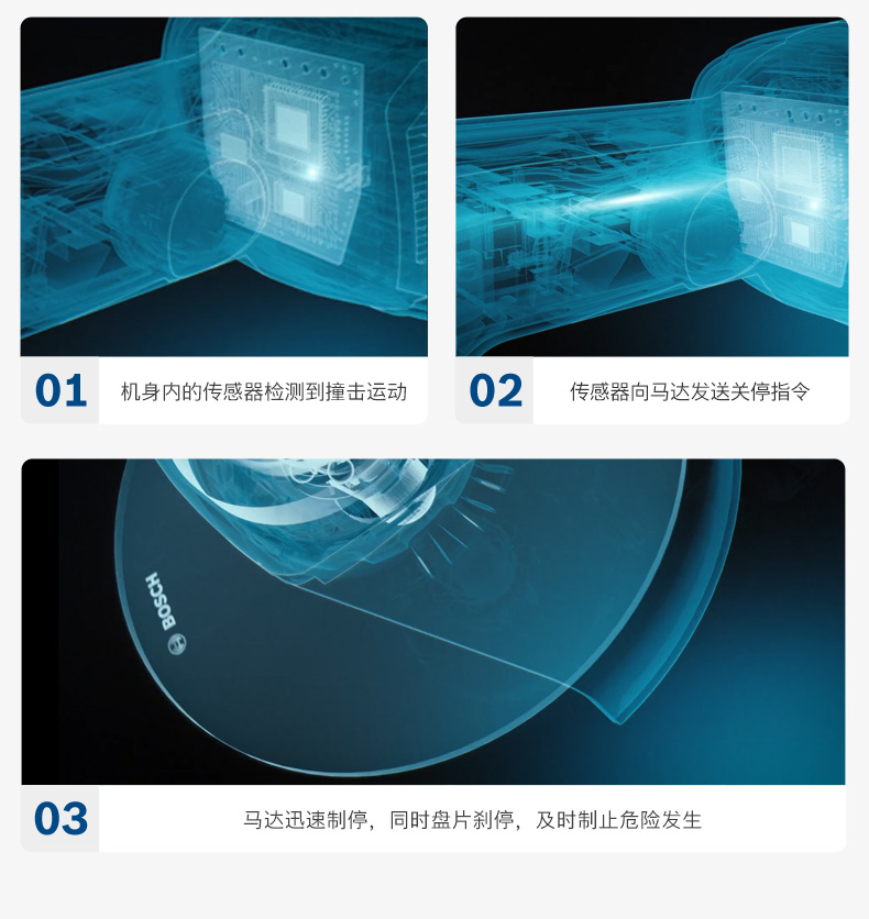 德国博世锂电充电式手提角磨机内置传感器在机器跌落砸地的瞬间侦测到撞击运动发送控制信号让角磨机断电关停。遭遇硬物自动停机保护手腕。当角磨机进行切割或者窄角打磨时被钢筋卡牢或硬物夹住,反弹保护传感器检测到由速度骤降带来的加速变化,发送信号制停角磨机。