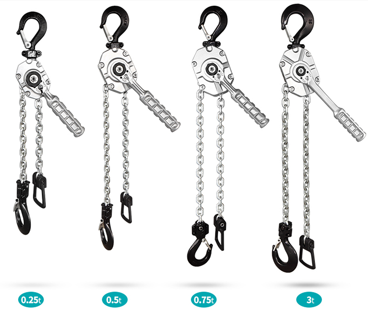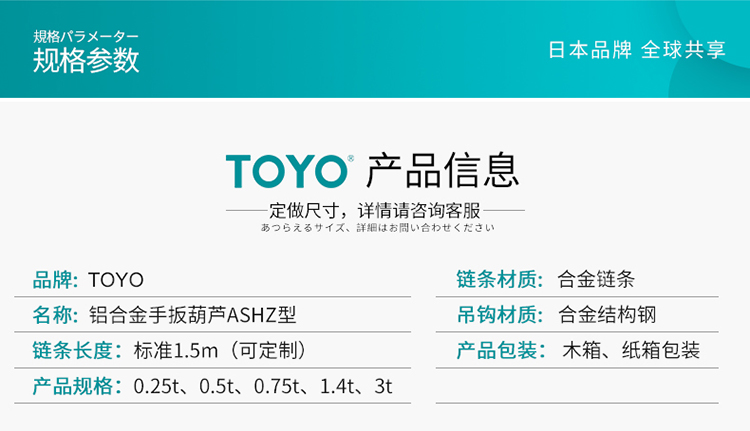 TOYO手扳葫芦一共有四个规格,0.25吨、0.5吨、0.75吨、3吨。