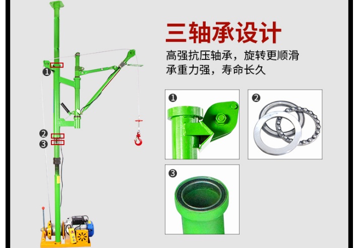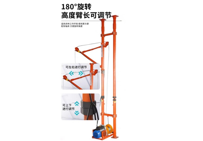 室内吊运机采用顶天立地结构设计,立柱顶住屋顶和地面,特点是不需要压配重,承重能力在100kg~500kg。